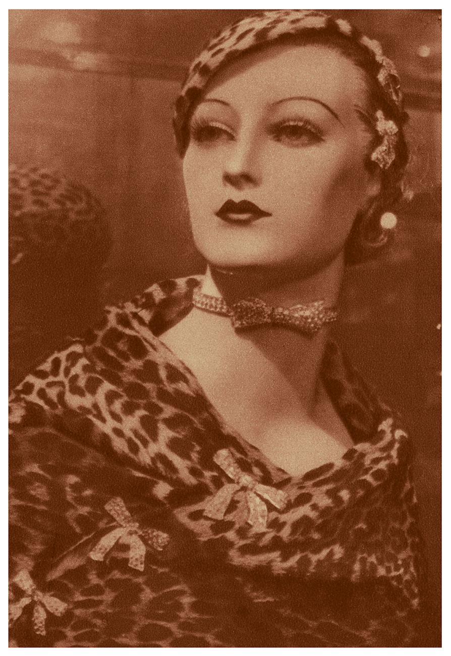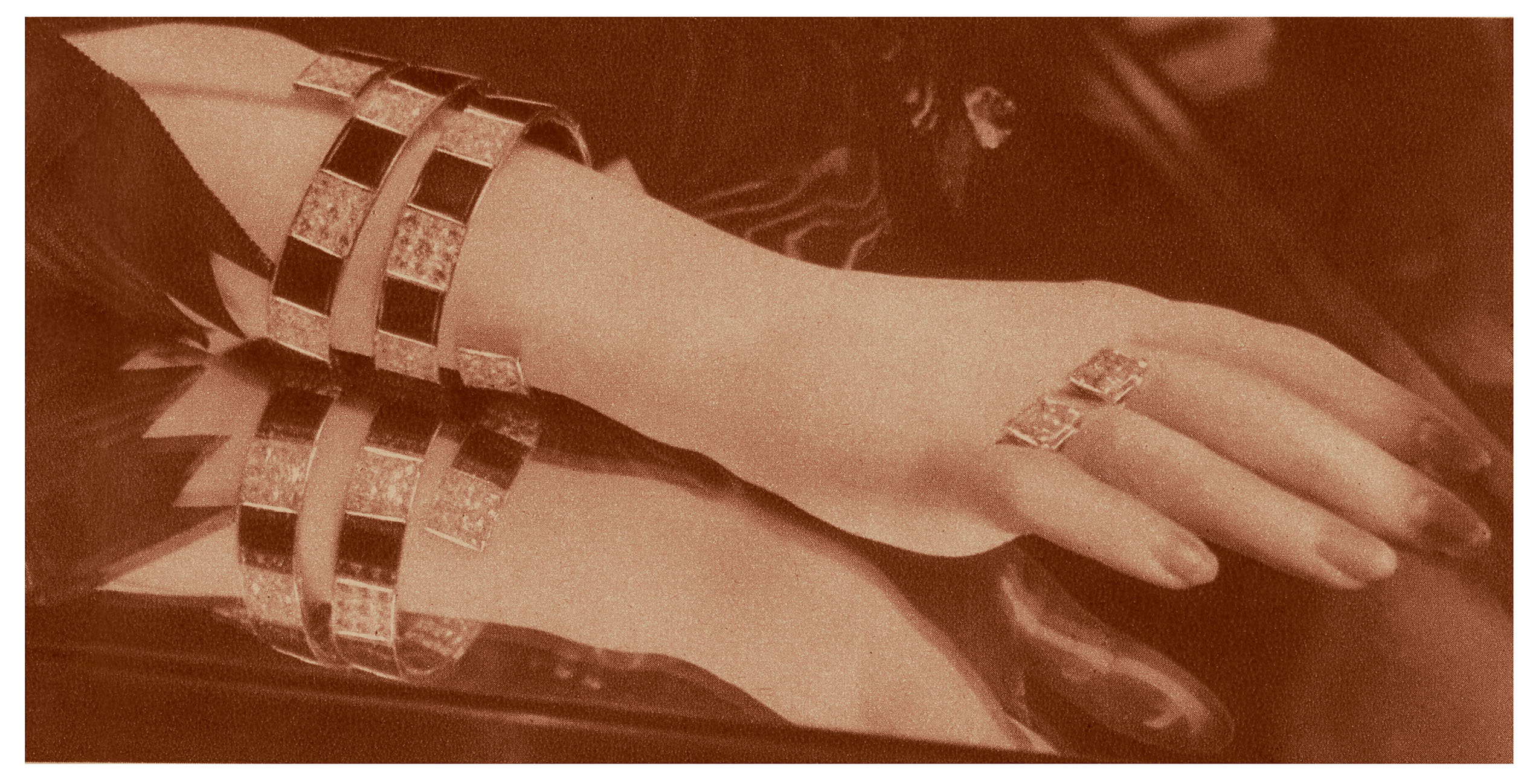 镶嵌钻石的缎带黑白相衬,环绕在腕间。目前记录在案的作品包括17枚胸针、9款头饰、8款项链、4枚戒指、3款手镯、2副耳环、2枚腕表与2件配饰,其中包含一个内外皆镶嵌钻石的烟盒,皆为衬托女性的绝美风华度身定制。