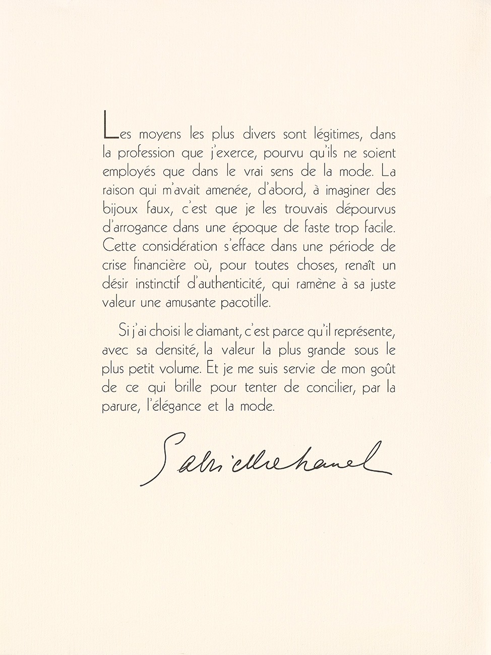 伦敦钻石公会将这个创意交给了一位有着远见卓识的女性。她让服装走入现代,同时在配饰设计领域亦独具天赋。她所推出的服饰珠宝甚至比真金白银更有魅力。这是一位强大的女性,执掌着一个疆域不断扩张的庞大帝国。她是艺术届与艺术家的挚友,她是时代的脉搏。她着眼于大洋两岸女性的命运、身体和精神风貌。这位被伦敦钻石公会选中为钻石注入新生的女性,就是嘉柏丽尔·香奈儿。